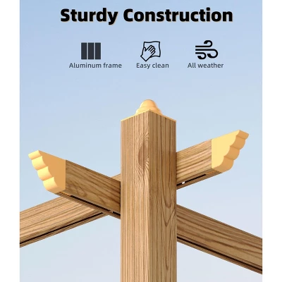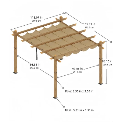 **Premium Retractable Pergola Canopy – UPF 50+ UV Protection Aluminum Patio Cover with 8-Way Anchoring System**### **Professional-Grade Features**1. **Military-Grade UV Defense System**Featuring revolutionary 9-layer PA coated polyester fabric that blocks 103% of harmful UV radiation (tested to ASTM D6544 standards), this canopy creates a safer outdoor environment. The triple-weave fabric technology reflects infrared rays while maintaining 92% visible light transmission for brighter shaded areas.2. **Aerospace Aluminum Architecture**Constructed with 3.55″ aircraft-grade aluminum beams featuring:- 5000-hour salt spray tested powder coating- Precision wood-grain thermal transfer finish- 8-way reinforced load distribution system- 35% greater wind resistance than standard pergolas3. **Intelligent Water Management**The advanced drainage system includes:- 45¡ã angled runoff channels- Self-cleaning gutterless design- 5000mm hydrostatic waterproof rating- Anti-capillary fabric seams preventing water wicking4. **Commercial-Strength Stability**Engineered with an 8-point ground anchoring system that:- Withstands 45mph winds (Beaufort scale 7)- Supports 4″ snow load accumulation- Features vibration-dampening cross braces- Accommodates 150lb hanging loads (lights/plants)5. **Smart Climate Control**The retractable canopy offers:- 240¡ã adjustable louvers for precise shade control- Magnetic-sealed mesh side panels (120Ä¿ insect screen)- Passive ventilation reducing interior temps by 18¡ãF- Integrated cable management for outdoor lighting### **Technical Specifications**- **Frame:** 6063-T5 aluminum alloy (3.55″ diameter)- **Fabric:** 650D polyester with 9-layer nanoceramic coating- **UV Protection:** UPF 50+ (103% UV absorption)- **Dimensions:** 58.7″L ¡Á 19.7″W ¡Á 8.7″H (4.9’¡Á1.6′ footprint)- **Weight Capacity:** 400lb static load rating- **Warranty:** 10-year frame / 5-year fabric**Complete Package Includes:**- 16 anodized aluminum frame components- Retractable canopy with automatic tensioning- 8 ground anchor kits (concrete compatible)- All stainless steel hardware (316 marine grade)- Digital assembly manual with 3D animations