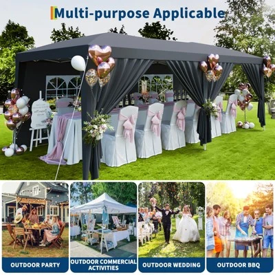 - 【Packing List】1 x 10×20 commercial pop up canopy frame, 1 x 10×20 tent top cover, 6 x PU coated side curtains, 4 x 210D Oxford cloth PVC coating, 18 x ground pegs, 6 x wind ropes, 1 x installation manual. We provide you with the best service, if you have any questions, please feel free to contact us. Choosing us will be your right decision.