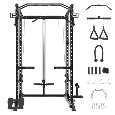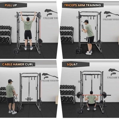 - ENDLESS TRAINING POSSIBILITIES: No home or garage gym should be without a power rack. Our power cage can bring power rack, cable Cross-Over machine, lat pulldown station, low row station (includes footplate attachment), chin station, dip station, core trainer, landmine station to your home gym at the same time. You can train your full-body with just one device. It can be used by multiple family members at the same time, making it perfect for your home gym.