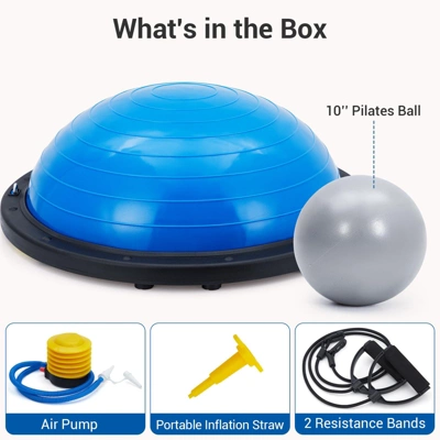 - BALL PUMP INCLUDED: The complete set includes a complimentary foot pump, allowing you to fully inflate the half-dome stability ball in under 5 minutes. The high-quality air valve prevents air leakage and extends the ball’s lifespan. We also include a 10-inch yoga ball to assist you in your training.