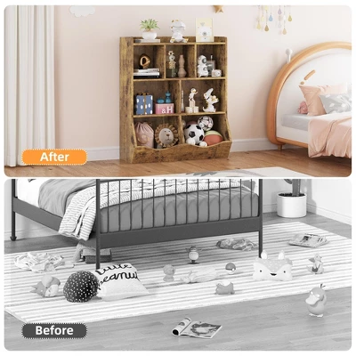 - PLENTY OF STORAGE SPACE: With 5 open compartments and 2 tilting boxes, this toy organizer is great for organizing your books and toys while showing off your style with adorable decor