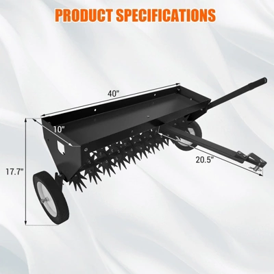 Professional 40-Inch Tow-Behind Spike Aerator – Heavy Duty Lawn Aerator with 11 Galvanized Steel Tines & Adjustable Tow Bar (Black, for Tractors & Lawn Care)Premium Features:Deep Soil Aeration Technology11 galvanized steel tine stars penetrate 2″ deep into compacted soil40″ working width covers large areas efficientlyCreates 3,000+ aeration holes per pass for optimal root oxygenationCommercial-Grade ConstructionAll-steel reinforced frame (14-gauge thickness)125 lb weight capacity tray (for enhanced soil penetration)Hot-dip galvanized finish resists rust and corrosionProfessional Mobility System2 heavy-duty 15″ pneumatic tires (4-ply rating)Adjustable tow bar (fits Category 0 & 1 hitch systems)360¡ã swivel hitch for easy maneuveringUser-Friendly ControlsQuick-release transport handle (foldable design)Dual-position control lever (transport/working modes)Extra-wide 48″ tow bar for stabilityVersatile Lawn Care SolutionIdeal for:Golf course maintenanceFarm pasture rejuvenationResidential lawn careSports field preparationTechnical Specifications:Working Width: 40 inchesTine Quantity: 11 stars (44 individual spikes)Penetration Depth: Adjustable 1″-2″Weight Capacity: 125 lbs (additional)Tire Size: 15″ pneumaticMaterials: Galvanized steel + rubberHitch Compatibility: Category 0 & 1Dimensions: 48″L x 40″W x 36″HWeight: 98 lbs