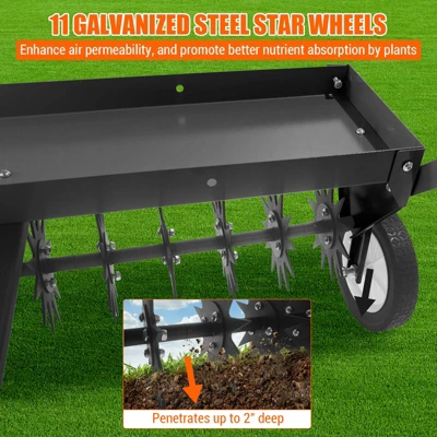 - Effective Deep Aeration: Equipped with 11 steel tine stars, this aerator penetrates compacted soil up to 2 inches deep, promoting healthier lawn growth by reducing soil crusting and improving nutrient absorption.