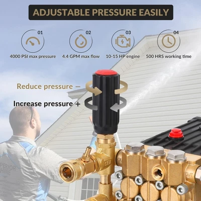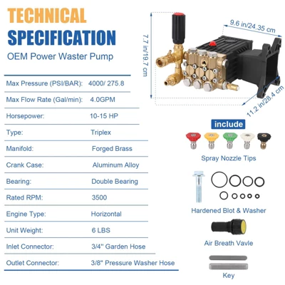 High Pressure Washer Pump 4400PSI 4GPM Gas Powered Industrial Water PumpProduct Description:Experience professional-grade cleaning performance with this industrial 4400PSI high-pressure water pump. Designed for both commercial and heavy-duty residential use, it delivers a powerful 4GPM flow rate that effortlessly removes stubborn stains from driveways, industrial equipment, vehicles, and concrete surfaces. Featuring a robust blackened crankcase and solid brass pump head, this unit ensures vibration reduction and stable operation under intense use. With quick-connect fittings, intelligent pressure regulation, and easy-maintenance design including a transparent oil window, this pump offers unmatched versatility and durability for all high-pressure cleaning applications.?Key Features:1. Industrial-Grade Cleaning Power? 4400 PSI at 4GPM provides exceptional cleaning force for removing tough grime, grease, and stains? Ideal for driveways, industrial machinery, fleet vehicles, and construction equipment2. Heavy-Duty Construction & Compatibility? Blackened crankcase and solid brass pump head ensure durability and vibration reduction? Standard 1-inch shaft hole design with 3/4-inch water inlet and 3/8-inch quick-connect outlet? SAE-compliant and compatible with major pressure washer brands and systems3. Complete Installation Kit? Includes cleaning hose, UNC 3/8-16 x 1-1/2″ bolts, shaft key, washers, O-rings, and vent plug? Step-by-step instructions enable quick setup and immediate operation4. Intelligent Pressure Control? Adjustable pressure reducing valve allows precise control from gentle vehicle washing to aggressive concrete cleaning? One machine handles multiple cleaning scenarios without compromising performance5. User-Friendly Maintenance? Transparent oil window enables easy oil level monitoring and contamination checks? Recommended oil changes every 60 operating hours for optimal performance? Maximum inlet water temperature: 104¡ãF (40¡ãC)?Specifications:? Brand: PeakPursuit? Color: Black? Power Source: Gas Powered? Pressure: 4400 PSI? Flow Rate: 4 GPM? Shaft Hole: 1-inch Standard? Water Inlet: 3/4-inch? Water Outlet: 3/8-inch Quick-Connect? Dimensions: 28.5L x 24.4W x 19.6H cm? Weight: 22.16 lbs? Special Features: Adjustable Pressure Valve, Transparent Oil Window, Vibration Reduction? Included Accessories: Installation Kit with Bolts, Washers, O-rings, Hose, and Instructions?Why Choose This Pressure Washer Pump??? Industrial 4400PSI/4GPM performance for toughest cleaning tasks?? Heavy-duty construction ensures longevity under frequent use?? Complete installation kit for immediate setup and compatibility?? Precision pressure control adapts to various cleaning needs?? Easy-maintenance design with visible oil monitoring system