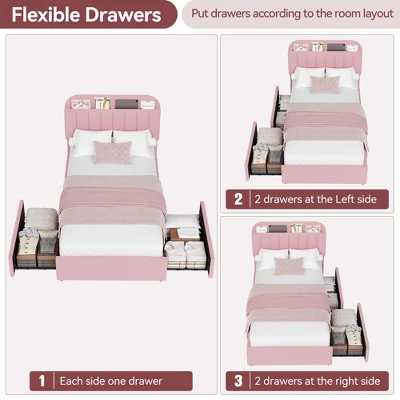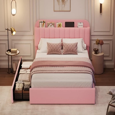 Create a cozy, organized, and stylish space for your child with this modern upholstered platform bed frame. Wrapped in luxurious boucle fabric, this twin-size bed delivers both soft-touch comfort and contemporary appeal. Its carefully designed bookcase-style headboard provides functional storage, offering a perfect spot for books, toys, electronics, and nighttime essentials ¡ª all within arm’s reach.This smartly engineered bed frame comes with two spacious drawers that can be positioned flexibly on either side or the foot of the bed, adapting seamlessly to various room layouts. The result is an ideal space-saving solution for compact bedrooms, shared rooms, or apartments where maximizing every inch matters.Built for durability and comfort, the bed features a sturdy metal frame reinforced with high-quality wooden slats, eliminating the need for a box spring. The platform structure offers stable mattress support and ensures a quiet, shake-free sleep experience.Assembly is designed to be simple and straightforward. With all parts clearly numbered and instructions included, the bed can be assembled in approximately 40 minutes. Whether for a child, teen, or guest room, this bed blends functionality and style in one elegant package.Product Specifications: