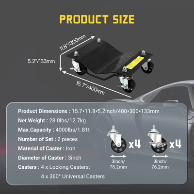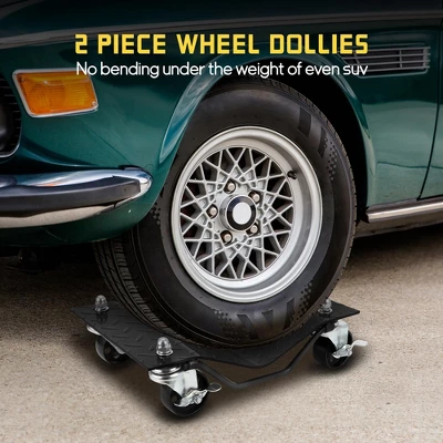 Car Dolly Set of 2 ¨C Heavy Duty 4000LB Capacity Wheel Skates for Moving Vehicles (Black, 15.7″x11.8″x5.2″)Key Features & Specifications:Industrial-Grade Capacity2,000 lbs/dolly (4,000 lbs total set)Reinforced steel panels (bend-proof)29.6 lbs total weightTire-Protection DesignCurved base (snug tire cradle)Anti-slip side rails5.2″ low-profile heightSmooth Mobility System4 x 3″ steel casters per dolly360¡ã rotation (concrete/epoxy friendly)15.7″L x 11.8″W platformUniversal Vehicle FitWorks with:? SUVs/Trucks? ATVs/RVs? SedansQuick Tool-Free Setup10-minute installationJack-compatibleParking/storage ready