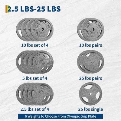 - 【Premium Cast Iron Construction】Made of heavy-duty cast iron with anti-rust coating, these 1-inch weight plates (2.5lb-25lb) fit all standard Olympi-c bars. Durable enough for daily strength training, home gym use.