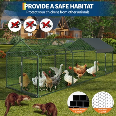 - 【Durable & Sturdy】The chicken coop is made of high-quality and durable galvanized iron pipes, which can withstand harsh outdoor conditions. Whether it’s rain, snow, or sun exposure, this durable material can provide long-lasting performance and protect your chickens and farm all year round.
