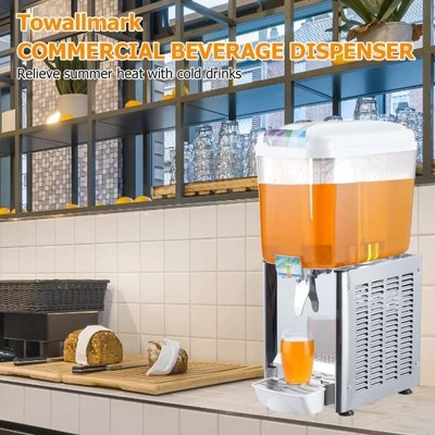 High-Demand 2 * 18L Commercial Beverage Dispenser ¨C Stainless Steel Iced Tea & Cold Drink Machine for Restaurants, Hotels, and PartiesKey Features & Specifications:Generous Capacity for High-Volume ServiceDesigned to meet the demands of busy environments, this 2 * 18L (approximately 9.5 gallons total) beverage dispenser ensures continuous service without frequent refills. Its large capacity makes it perfect for restaurants, hotels, and large gatherings where high beverage turnover is essential.Premium Stainless Steel ConstructionCrafted from food-grade stainless steel, this dispenser combines durability with hygiene. The silver finish resists corrosion and is easy to clean, while the sturdy build (weighing 62.8 lbs) ensures stability during operation. Dimensions: 20.47″L x 19.09″W x 29.72″H, offering a compact yet spacious design for countertop use.Efficient Cooling & Temperature ControlEquipped with a 370W high-performance cooling system, this machine maintains optimal beverage temperatures even under heavy use. The evaporator tray enhances cooling efficiency, ensuring drinks like iced tea, fruit juices, or cocktails stay refreshingly cold.Versatile Beverage CompatibilityBeyond iced tea, this dispenser handles a wide range of cold beverages, including milkshakes, soy milk, yogurt, coffee, and cocktails. Its design prevents cross-flavor contamination, making it ideal for multi-drink service.User-Friendly & Hygienic DesignFeatures like the enlarged drip tray minimize spills and simplify cleanup, while the ergonomic taps ensure smooth pouring. The TROPOW brand guarantees reliability, backed by a robust structure built for daily commercial use.