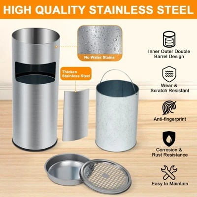 Design and Aesthetics: Its modern, clean-lined design with a polished stainless steel finish ensures the trash can blends seamlessly into various environments, from home kitchens to outdoor patios and commercial venues. The side-open mouth design adds a practical yet stylish touch, enhancing usability without compromising appearance.Additional Functionalities: This versatile trash can doubles as an outdoor ashtray, making it suitable for multiple settings including homes, offices, hotels, gardens, patios, and parks. Its design supports effective waste management while maintaining a neat and orderly space.Packaging and Accessories: The package includes the stainless steel trash can with a removable inner bucket and lid, ready for immediate use.Care Instructions: To maintain its pristine appearance, simply wipe the stainless steel surface with a damp cloth. Regular cleaning of the removable inner bucket and lid will ensure optimal hygiene and functionality.Customer Service and Warranty: This product is backed by reliable customer support to assist with any inquiries or concerns, ensuring your satisfaction and peace of mind.Notes and Disclaimers: Please note that due to variations in display settings, the actual color and finish may appear slightly different from images shown.This 4.5 Gallon/17 L Indoor Outdoor Trash Can is a practical, durable, and hygienic solution for waste management in a variety of settings, combining thoughtful design with robust construction to meet the demands of both residential and commercial use.