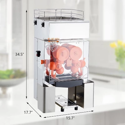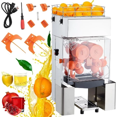 **Commercial Citrus Juicer ¨C High-Efficiency Triple-Roller Juicer with Quiet Motor & Safety Lock** **Product Description:** The **SLEKVERSA Commercial Citrus Juicer** is engineered for **high-volume juicing operations**, featuring a **triple-roller extraction system** that processes **22-30 oranges per minute** (40-80mm diameter). Built with **food-grade stainless steel and PP materials**, this juicer delivers **durable, hygienic performance** for busy juice bars, restaurants, and cafes. The **reverse rotation function** prevents jams, while the **safety interlock system** ensures operator protection. With **easy-to-clean removable parts** and a **quiet motor**, this juicer combines **speed, safety, and convenience** for professional use. — ### **Key Features:** 1. **High-Speed Juicing (22-30 Oranges/Minute)** – **Triple-roller extraction** maximizes juice yield – Handles **oranges, pomegranates, lemons, and other citrus fruits** – **Reverse rotation** clears obstructions for uninterrupted operation 2. **Enhanced Safety Features** – **Lid-integrated interlock** prevents operation when open – **On/Off switch with protection** against liquid contact – **Stable, tilt-resistant design** for secure use 3. **Easy Maintenance & Cleaning** – **Pull-out filter** for quick residue removal – **Detachable pulp bins & trays** simplify washing – **Stainless steel & PP construction** res stains and odors 4. **Durable Commercial-Grade Build** – **Food-contact safe stainless steel** (corrosion-resistant) – **Heat-resistant PP components** for long-lasting use – **Tilted feeding/discharge ports** minimize clogging 5. **Versatile for Multiple Settings** – Ideal for **juice bars, cafes, restaurants, gyms, and offices** – **Quiet motor** ensures low disturbance in busy environments – **Compact footprint** (24.8″ x 22.44″ x 44.88″) fits most workspaces — ### **Specifications:** – **Material:** Stainless Steel (food-grade) + PP – **Dimensions:** 24.8″D x 22.44″W x 44.88″H – **Capacity:** 22-30 oranges/minute (40-80mm size) – **Special Features:** – Quiet motor operation – Reverse rotation anti-jam function – Microwave-safe removable parts – Safety interlock lid