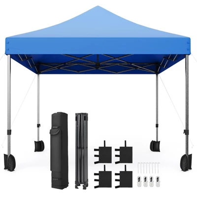 TROPOW 10¡Á10 Commercial Instant Pop-Up Canopy – Heavy-Duty Outdoor Tent with Roller Bag (Blue)1?? One-Minute Professional Setup? Single-button deployment system for instant assembly? Pre-assembled truss frame requires no tools? Includes wheeled roller bag for effortless transport2?? Industrial-Grade Construction? 500D polyester canopy with 3000mm PU waterproof coating? 1.25″ powder-coated steel frame withstands commercial use? UPF 50+ UV protection blocks 98% harmful radiation3?? Smart Adjustable Design? 3-height settings (adjust with push-button mechanism)? Integrated sandbag pockets (4¡Á 8lb bags included)? Ventilated peak design reduces wind resistance4?? All-Weather Performance? 100 sq.ft coverage comfortably fits 4-8 people? Wind-resistant up to 25mph when properly anchored? Mold & mildew resistant fabric for humid conditions5?? Multi-Event Versatility? Professional navy blue finish for business or personal use? Ideal for markets, weddings, beaches & emergency shelter? Fire-retardant treated material meets safety standards?? Technical Specifications? Dimensions: 118″L ¡Á 118″W ¡Á 130″H (9.8’¡Á9.8’¡Á10.8′)? Frame: Powder-coated steel (1.25″ diameter)? Fabric: 500D polyester (PU3000mm coating)? Weight: 54 lbs??? Complete Package Includes? 4¡Á sandbag weights? Wheeled storage roller bag? Frame protection caps?? Certifications? UPF 50+ sun protection rating? Waterproof (3000mm hydrostatic head)? 1-year commercial warranty?? Perfect For:? Farmers markets & trade shows? Outdoor weddings & events? Beach/poolside relaxation? Food vendor stalls? Emergency weather shelter?? Premium Features:? Reinforced corner joints? Anti-rust powder coating? High-visibility reflective accents? Quick-drying fabric technology
