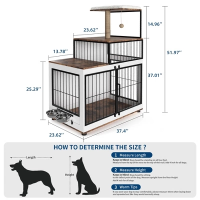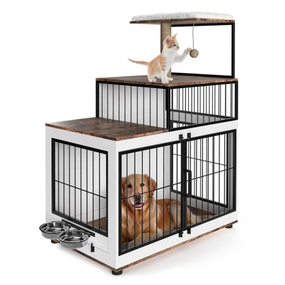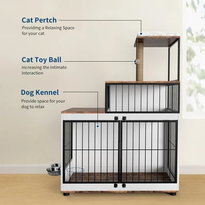 Elevate your home with this multifunctional dog crate furniture, expertly designed to serve as both a cozy retreat for your pet and a versatile organizational piece for your space. Crafted from high-quality wood in a vintage-inspired two-tone finish, this unit combines a secure dog kennel with an integrated cat tower and shelving system¡ªperfect for households with both dogs and cats.