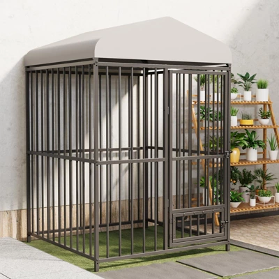 1.Heavy-Duty Upgraded Iron Construction: Fortress-Like Safety for Giant BreedsThis outdoor dog kennel is built to withstand the strength and energy of medium to giant dogs (e.g., German Shepherds, Great Danes, or Rottweilers), featuring upgraded iron guardrails that resist bending, rust, and fading—even with daily scratching, leaning, or playful jumping. The thickened iron bars (thicker than standard wire kennels) create a rigid, stable frame that won’t warp or break under pressure, while a corrosion-resistant coating protects against rain, humidity, and outdoor elements (no rusting after summer storms or winter snow). Unlike flimsy plastic or lightweight metal kennels that pose escape risks, this design acts as a “fortress”: the tight rail spacing (narrow enough to prevent paws from getting stuck) and reinforced corners ensure your pet stays safely contained, even when they’re eager to explore. It’s built for years of reliable use, making it a long-term solution for outdoor pet housing.2.All-Weather UV-Waterproof Roof: Year-Round Protection in Any ClimateEngineered to shield your pet from harsh weather, the kennel includes a tight-fitting, waterproof roof cover with UV resistance—blocking rain, snow, wind, and damaging sunlight. The cover is secured with heavy-duty straps that keep it anchored during strong winds (no blowing off mid-storm), while its sloped design prevents water or snow pooling (a common flaw in flat-roof kennels that leads to leaks or sagging). In summer, the UV coating reflects sunlight to keep the kennel interior up to 15°F cooler than the outside air, avoiding overheating; in winter, it traps warmth and repels snow, keeping your dog dry and comfortable even in freezing temperatures. Whether you live in rainy coastal areas, snowy northern regions, or sunny deserts, this roof turns the kennel into a weatherproof shelter that lets your pet enjoy the outdoors safely, no matter the season.3.Rotating Stainless Steel Feeder + One-Hand Door Lock: Effortless, Secure CareDesigned for busy pet owners, the kennel features an innovative stainless steel swivel feeder system that eliminates the need to open the main door for feeding—preventing escape attempts (especially common with food-driven dogs) and reducing stress for both you and your pet. The swivel bowls rotate outward, letting you fill them with food or water easily, then spin back into the kennel—no gaps for your dog to squeeze through. The stainless steel material is rust-resistant, easy to clean (just wipe with a damp cloth), and safe for food contact. Complementing this is a one-hand operable door lock: a simple, sturdy latch that opens and closes with one hand, making it easy to let your dog in/out even when you’re holding a leash, treats, or cleaning supplies. These features streamline daily routines (feeding, potty breaks, playtime) without compromising safety.4.4x4x6FT Spacious Design: Multi-Pet & Multi-Use VersatilityWith generous 4x4x6ft dimensions, this kennel offers ample room for one large dog to stretch, lie down, and play—or multiple smaller to medium dogs (e.g., two Labradors) to coexist comfortably. The open interior isn’t just for dogs, either: it adapts seamlessly to other outdoor pets, such as chickens, rabbits, or small farm animals, acting as a secure playpen or shelter. Enhanced ventilation (thanks to the open iron rail design) ensures constant airflow, preventing stuffiness and reducing odors—keeping the space fresh and healthy for your pet, even on hot days. Whether used as a permanent outdoor dog house, a temporary playpen for visiting pets, or a secure space for farm animals, its size and versatility make it a practical addition to any backyard, farm, or rural property.5.Quick Assembly + Low-Maintenance Stain-Resistant BuildSetting up this outdoor kennel is fast and frustration-free, even for those with minimal DIY experience. The package includes intuitive, step-by-step instructions (with clear diagrams) and all necessary hardware (nuts, bolts, tools)—no missing parts or confusing technical jargon. Most people can assemble it in under an hour (with a helper for lifting larger frame pieces), and no power tools are required. Maintenance is equally simple: the stain-resistant iron guardrails and waterproof roof cover can be cleaned with a quick hose-down—just rinse away dirt, mud, or pet hair, and let it air dry. There’s no scrubbing, repainting, or replacing parts often—saving you time and effort to focus on spending quality time with your pet.