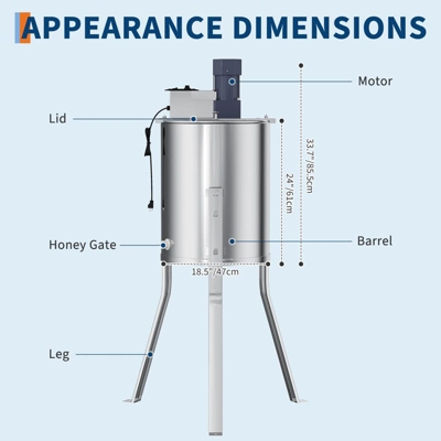 Electric Honey Extractor ¨C Stainless Steel Honey Spinner with 140W Motor & Adjustable SpeedMaximize your honey extraction efficiency with our premium stainless steel honey extractor, designed for beekeepers who demand durability, hygiene, and performance. Whether you’re a hobbyist or a small-scale producer, this multi-frame honey spinner ensures smooth, contamination-free extraction with minimal effort.Key Features:? Multi-Frame Compatibility ¨C Works seamlessly with shallow, medium, and deep frames (holds up to 2 frames at once). Enclosed metal gears prevent contamination, keeping honey pure.? Clear Observation Lid ¨C The transparent acrylic cover lets you monitor the spinning process, while the built-in handle ensures easy transport between apiary stations.? Adjustable Stable Base ¨C Features a triangular leg design (adjustable height: 30-38cm / 12-15″) for wobble-free operation. Made from food-grade stainless steel to resist rust and honey corrosion.? Leak-Proof Stainless Steel Drum ¨C Constructed from seamless 304 stainless steel, ensuring zero honey leakage. Smooth, easy-clean surfaces meet food safety standards.? Ergonomic Manual/Electric Operation ¨C The anti-slip crank reduces effort by 40% compared to traditional models. The 140W motor with adjustable speed allows for efficient, hands-free extraction (manual operation also available).Technical Specifications: