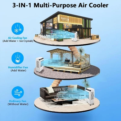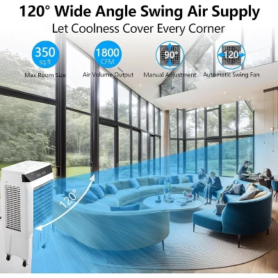 This 3-in-1 portable evaporative cooler delivers whole-space temperature management through its high-volume 1800CFM airflow and efficient water evaporation system. The large top-fill tank enables extended operation as an overnight room cooler, while triple-sided intake panels enhance its swamp cooler air conditioner effectiveness. Mobility features including four casters and vertical design make it ideal as a garage portable swamp cooler or outdoor cooling fan for patios. Dual oscillation (120° auto horizontal + 90° manual vertical) ensures even air distribution as a whole-house cooler fan, and the included remote allows convenient adjustment of fan speeds, timers, and modes. When used with ice packs, this evaporative air cooler provides enhanced cooling comparable to conventional air conditioners in arid climates.Stay cool anywhere with this energy-efficient, remote-controlled evaporative cooler—perfect for homes, workspaces, and outdoor use.