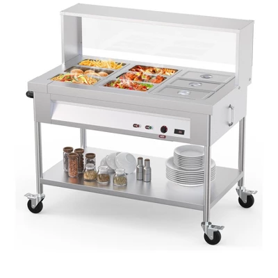 1.Large Capacity for Ample Serving This commercial electric food warmer is designed with a remarkable capacity to serve up to nine different dishes simultaneously. It’s a perfect fit for maintaining the heat of a diverse range of food items. Whether it’s the freshness of steamed vegetables, the warmth of hot dogs, the richness of eggs and bacon, or other hot delicacies, this warmer has got you covered. Additionally, the spacious undershelf offers convenient storage space, allowing you to keep extra supplies and utensils within easy reach, making it highly practical for busy service environments. 2.Robust and Durable ConstructionConstructed from high – quality stainless steel with a thickness of 0.32 inches, this electric food warmer is built to last. The premium stainless steel not only provides excellent corrosion resistance, ensuring its longevity even in humid commercial settings, but also makes it easy to clean. This robust build guarantees reliable performance over time, making it a worthy investment for any commercial establishment such as restaurants, catering services, or event venues. 3.Thoughtful Design DetailsEquipped with a faucet and water pipe, this steam table enables effortless drainage, saving you time and effort during cleaning and maintenance. The acrylic guard is a great addition as it helps minimize the presence of moisture and air droplets, thereby enhancing food safety and hygiene. Furthermore, the steam table comes with lockable wheels and a handle, providing enhanced portability. This makes it convenient to move around, whether you need to reposition it for a different event layout or for easy storage when not in use. 4.Precise Adjustable TemperatureThe food warmer allows you to easily set and closely monitor the temperature, ensuring that your dishes are always kept at the perfect serving heat. Its efficient heating system is designed to save energy. Once the desired temperature is reached, the system automatically shuts off, and it restarts as soon as the temperature drops below the set point. This not only helps in maintaining the ideal temperature for your food but also contributes to cost – effective operation. 5.Versatile ApplicationsThis commercial food warmer is extremely versatile in its applications. It can effectively keep a wide variety of dishes warm, including nacho cheese, thick stews, eggs, comforting porridge, and flavorful soups. It is an ideal choice for various commercial and social settings. Whether it’s a bustling restaurant, a catering event, a lively party, a food truck on the go, or any other gathering where hot food needs to be served, this food warmer meets both daily and commercial requirements with ease.