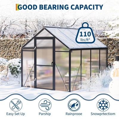 1.Upgraded Heavy-Duty Construction for Year-Round DurabilityThis outdoor greenhouse is built to last, featuring a reinforced aluminum frame and heavy-duty ground spikes that set it apart from standard models. The robust aluminum structure resists rust, corrosion, and warping, even in extreme weather—from scorching summer heat to freezing winter temperatures. The included ground nails securely anchor the greenhouse to various terrains (grass, soil, or patio), preventing shifting or tipping during strong winds. This combination of strength and stability ensures your plants stay protected year-round, making it a reliable growing space for both novice and experienced gardeners.2.Effortless Quick Setup with Slide-In PanelsSay goodbye to complicated assembly with this greenhouse’s user-friendly quick-install system. Designed with slide-in polycarbonate panels (tested over 500 times for durability), the setup process is 40% faster than traditional greenhouses—most users can assemble it in a few hours with minimal tools. The intuitive design not only saves time but also boosts stability by 35%, thanks to precision-engineered connections that lock panels and frame components tightly together. Whether you’re a DIY enthusiast or new to gardening structures, the hassle-free assembly lets you start growing sooner.3.High-Performance Polycarbonate Panels for Optimal Plant GrowthEquipped with tough 720g/m² polycarbonate panels, this greenhouse balances light and protection perfectly. The panels are nearly unbreakable (resisting impacts from hail or falling branches) and allow 70% light transmission—ideal for photosynthesis and healthy plant growth. They also block over 99.9% of harmful UV rays, preventing leaf burn and ensuring delicate seedlings, vegetables, and herbs thrive. The panels’ insulation properties help regulate temperature, keeping the interior warmer in winter and cooler in summer, creating a stable microclimate for year-round cultivation.4.Enhanced Stability & Weather ResistanceBuilt to withstand diverse weather conditions, the greenhouse features versatile base feet that can be anchored in multiple ways: buried in soil, secured with concrete, or attached to a wooden board using the included screws. This adaptability ensures maximum resistance to wind, snow, and heavy rain. Additionally, integrated rain gutters on both sides channel water away from the base, preventing pooling and potential damage. The combination of secure anchoring and smart drainage makes this greenhouse a sturdy choice for any outdoor setting, from windy coastal areas to snowy regions.5.Innovative Design with Convenient FeaturesThis greenhouse is designed for both functionality and ease of use. It includes a smooth-sliding, lockable push door—providing easy access while keeping pests, rodents, or unauthorized visitors out. Adjustable roof vents promote continuous airflow, preventing humidity buildup and ensuring plants get fresh air—critical for preventing mold and mildew. The walk-in design offers ample space for growing a variety of plants, and the interior can even be customized with shelves or small furniture, transforming it into a cozy gardening retreat. With these thoughtful features, maintaining your plants becomes simpler and more enjoyable.