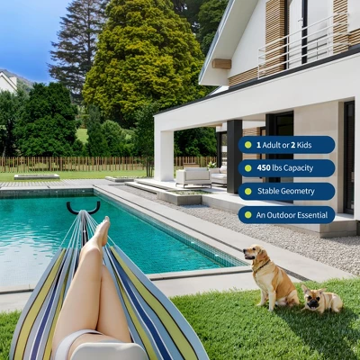 Made with thicker, tightly woven cotton fabric, this hammock evenly distributes weight for superior comfort. The gently wrapped sides cradle you for a weightless lounging experience.Sturdy & Spacious for Two
