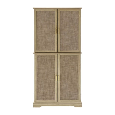 This light oak storage cabinet combines farmhouse charm with practical organization, featuring four woven rattan doors that conceal six adjustable shelves and a smooth-gliding center drawer. Measuring 29.9″W x 15.4″D x 71.7″H, its tall profile maximizes vertical storage in compact spaces.