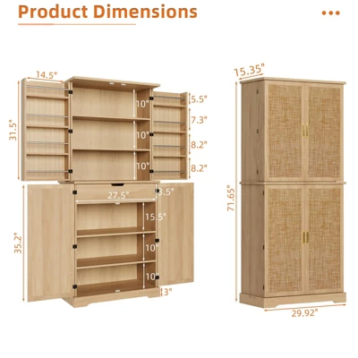 - Stylish Rattan Design: This storage cabinet blends rustic farmhouse charm with a natural wood finish and intricately designed rattan doors. It enhances your kitchen decor while offering a functional storage solution that suits any interior style