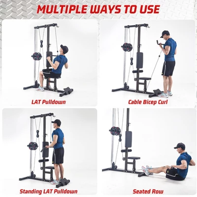 - 【Multi-functional LAT Tower】 Designed with high and low pulleys for a variety of exercises, including seated rowing, seated and standing pull-downs, bicep curls, and other movements. This versatile training machine allows you to fully engage all major muscle groups to meet your fitness goals.