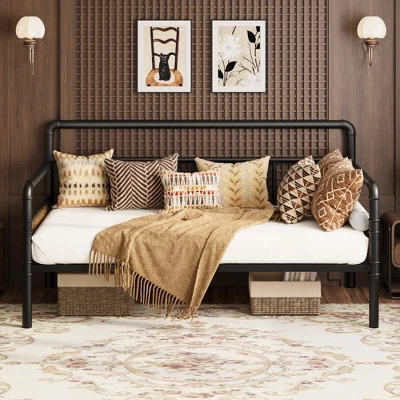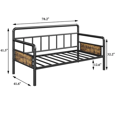 This daybed combines robust construction with practical functionality through its dual-purpose design. The industrial metal framework provides lasting durability, while the curved armrests and wood-grain headboard offer visual warmth. The elevated base creates valuable storage space, and the integrated slat system ensures proper mattress support without requiring additional foundations. Suitable for various residential settings, it delivers both style and utility in a space-efficient footprint.