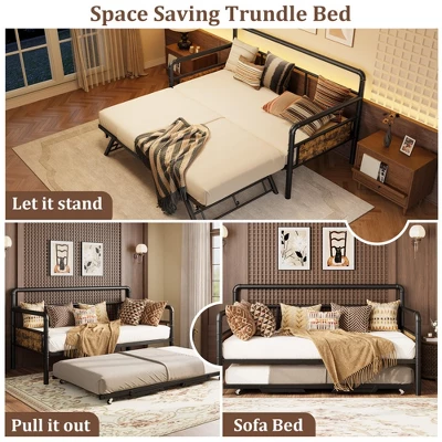 - 【Industrial & Retro Design】The elegant wood grain design of the brown headboard,smooth lines and the bright appearance of this trundle bed make people feel comfortable. The vintage metal tubes and round armrests design adds an elegant retro touch to a classic design.