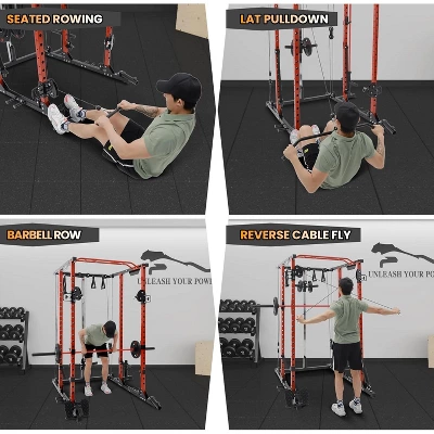 - Endless Training Possibilities: This power cage combines a power rack, cable cross-over machine, lat pulldown, low row, chin, dip, core trainer, and landmine station in one, allowing full-body workouts for multiple users simultaneously at home.