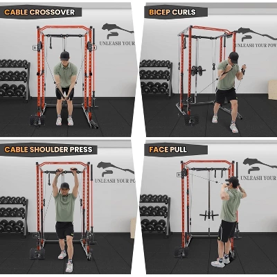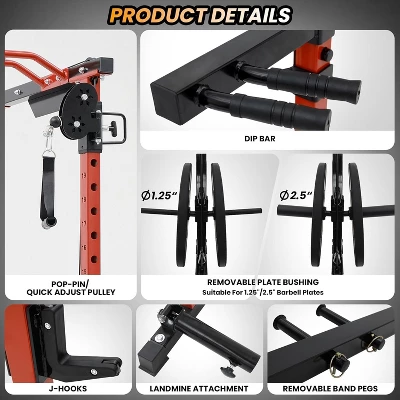 Power Cage with Lat Pulldown, Home Gym Power Rack with Cable Crossover System1. Comprehensive All-in-One Training StationThis integrated power cage combines seven key training stations into a single, space-efficient unit, eliminating the need for multiple machines. It features a fully-equipped power rack, an adjustable lat pulldown and low row system, a dual-function cable crossover, a dip station, a landmine attachment, and a core trainer. This versatility supports hundreds of exercises—including squats, bench presses, pull-ups, rows, cable flys, and tricep dips—making it ideal for everything from heavy strength training to high-intensity interval workouts, all within one compact footprint.2. Extensive Package of 23 Professional AttachmentsThe system comes complete with a full suite of high-quality attachments ready for immediate use. This includes a lat pulldown bar, tricep rope, ankle strap, multiple cable handles, J-hooks, safety straps, dip bars, a landmine attachment, resistance band pegs, weight clips, and a dedicated footboard for performing leg presses and calf raises. This extensive collection allows for targeted training of every major muscle group without requiring any additional purchases.3. Industrial-Strength Construction and SafetyEngineered with a heavy-duty 2″x2″ aluminum frame and a durable powder-coated finish, the cage is built to withstand years of intense use while resisting corrosion and wear. It boasts an impressive 1500 lb weight capacity, accommodating even the most advanced lifters. Critical safety components include reinforced J-hooks that securely hold barbells and robust safety straps designed to protect users during heavy lifts, ensuring a secure training environment.4. Optimized Spatial Design for Home UseDespite its professional capabilities, the cage is designed to fit comfortably in most home gyms, garages, or basements. With overall dimensions of 71 inches in length, 55 inches in width, and 86 inches in height, it maintains a compact 18.6-square-foot footprint. The design includes a generous 63-inch walk-in space for easy and safe entry and exit, which is crucial for exercises like squats and bench presses.5. Streamlined Assembly and Customer SupportThe product is shipped in two carefully packaged boxes to ensure all parts arrive undamaged. The assembly process is straightforward with detailed instructions, though a two-person setup is recommended for efficiency and safety. Responsive customer support is available to provide assistance throughout the assembly process and for any future questions.Technical Specifications:• Frame Material: Heavy-duty 2″x2″ aluminum with powder-coated finish• Color Options: Red/Black• Total Weight Capacity: 1500 lbs• Assembled Product Weight: 230 lbs• Overall Dimensions: 71″ L x 55″ W x 86″ H• Internal Walk-In Space: 63″• Base Footprint: 18.6 sq. ft.• Included Attachments: 23 professional accessories