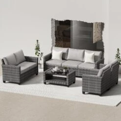 Patio Furniture Sets 6 Pieces, PE Wicker Modern Patio Conversation Set With Storage Cushions