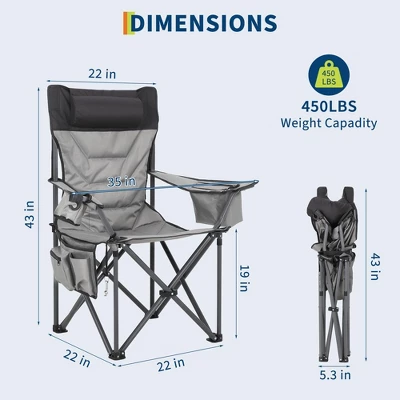 - 【Portable & Easy to Use】Ready in seconds—just unfold and relax. This oversized camping chair folds down to 43 x 5.3 inches and expands to a generous 43 x 35 x 22 inches, offering both comfort and portability. Weighs only 12.5 lbs, making it the ideal folding chair for camping or tailgating.