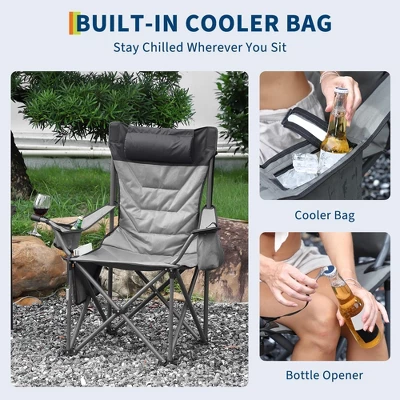 “Oversized Camping Chairs 2 Pack – Heavy Duty 500Lb Capacity Folding Chairs with High Back & Pillow, Includes Cooler Bag & Cup Holder (Grey)”Product Overview:The TROPOW Oversized Camping Chairs deliver premium comfort and durability for outdoor enthusiasts. This 2-pack set features 500lb capacity steel frames paired with 600D Oxford fabric for all-day relaxation. With high-back designs, built-in headrests, and multiple storage accessories, these 22″D x 35″W x 43″H chairs are ideal for camping, beaches, or backyard gatherings.Key Features & Specifications:Industrial-Strength Construction500lb weight capacity (reinforced alloy steel frame)Double-layer 600D Oxford fabric (tear/abrasion-resistant)Scratch-resistant powder coating for weather protectionLuxury Comfort DesignHigh backrest + thick headrest pillow (ergonomic support)Full-seat cushioning (2″ padded seat and back)Breathable mesh panels prevent overheatingSmart Outdoor ConvenienceSide mesh pockets + detachable cooler bag (holds 6 cans)Built-in cup holder & bottle openerWine glass loop for secure drink storagePortable & Space-SavingFolds to 43″ x 5.3” (fits most car trunks)Lightweight 12.5 lbs per chairAnti-slip rubber feet for stability on uneven groundAll-Season VersatilityUV-resistant fabric (withstands sun exposure)Easy-wipe cleaning (water/stain-repellent)Ideal for camping, tailgating, fishing, or concerts