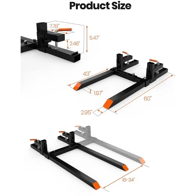 1.Versatile Compatibility for Heavy-Duty Tasks These clamp-on pallet forks boast a 2000 lbs load capacity, making them ideal for handling heavy items across various jobs. Designed to fit most loader bucket tractors, skid steers, and loader attachments, they seamlessly integrate with your existing equipment to simplify transporting logs, lumber, firewood, hay bales, fence posts, or debris. Whether you¡¯re working on a farm, construction site, or warehouse, their robust capacity ensures you can move a wide range of heavy loads efficiently. 2.Tool-Free Installation & Multi-Scenario UseSetting up these pallet forks is quick and hassle-free: simply slide them onto the cutting edge of your bucket, then secure with the clamp lock¡ªno extra tools required. This user-friendly design lets you switch between tasks in minutes. Beyond standard pallet handling, they excel at moving bulky items like stacked lumber, clearing brush, or relocating heavy equipment, making them a versatile addition to any work fleet. 3.Durable Construction & Enhanced Safety FeaturesCrafted from coated welded steel with thick rectangular tube walls, these forks are built to withstand rigorous use without bending or warping. The corrosion-resistant coating protects against rust, ensuring longevity even in outdoor or damp environments. Safety is prioritized with chain holes (for securing heavy loads), rollback protection slots (preventing accidental slippage), and a sturdy frame that minimizes »Î¶¯ during transport¡ªkeeping you and your equipment secure. 4.Adjustable Stabilizer Bar for Precise HandlingThe included adjustable stabilizer bar solves the common issue of forks spreading too far apart, which can complicate lifting bales, logs, or uneven loads. With a width adjustment range of 13¡± to 23¡±, you can easily set the perfect spacing using the convenient knob. This feature ensures stable, balanced lifting, reduces load shifting, and makes maneuvering awkwardly shaped items far simpler. 5.Detailed Specifications for Perfect FitMeasuring 43¡± in overall length, these forks feature 30¡± long tines (2.95¡± wide x 1.97¡± high) to accommodate standard pallets and large items. The barrel lip gap of 2.48¡± ensures a secure fit on most bucket edges. Each package includes 1 pallet fork set, 1 adjustable stabilizer bar, and a user manual¡ªeverything you need to get started. Built for reliability, they¡¯re tested to handle daily heavy use, making them a long-lasting solution for material handling needs.