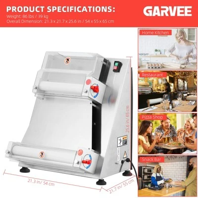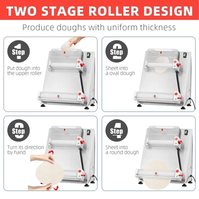 - 【Pizza Thickness & Size Adjustment】Our Commercial Pizza Dough Roller Sheeter is equipped with two thickness control knobs. By adjusting the knobs, you can create 0.02-0.2 inch thick doughs. Meanwhile, wide rollers can roll out 4-15.7 inch pizza dough, satisfying all your requirements for making different pizza sizes.