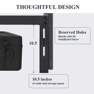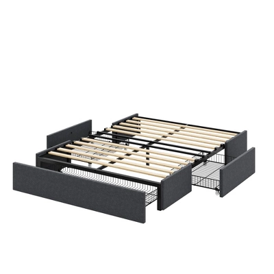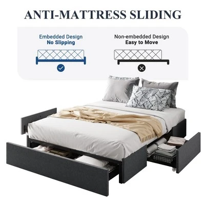 Upgrade your bedroom with this modern upholstered platform bed frame, thoughtfully designed for both style and function. The low-profile frame is wrapped in a dark grey, linen-look fabric that effortlessly blends with a variety of interior design themes, from contemporary to minimalist. The clean lines and simple profile bring a chic and understated elegance to your sleeping space.This bed frame goes beyond aesthetics by offering smart storage solutions. Equipped with three spacious drawers ¡ª one on each side and one at the foot of the bed ¡ª it provides ample room for storing seasonal clothes, extra linens, or everyday essentials, helping you keep your room tidy and organized.The sturdy metal frame is reinforced with durable wooden slats that support your mattress directly, removing the need for a box spring. Designed with a low center of gravity and a strong structure, it can support up to 800 pounds. Anti-slip strips and a unique buckle structure help minimize movement and noise, ensuring a quiet and stable sleeping experience. Plastic foot plugs protect your floors from scratches.In addition, the open design without a fixed headboard offers flexibility ¡ª pre-drilled holes in the legs allow you to pair the frame with a headboard of your choice, giving you full control over the look of your bedroom.Assembly is straightforward and efficient. All parts and tools are neatly packed in a single box, with each piece clearly labeled. Two adults can assemble the bed in about 30 minutes.Product Specifications: