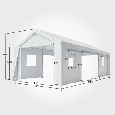 1.Multi-Purpose All-Season Shelter This 12×20 FT portable garage is designed to adapt to diverse needs, with additional size options (10’/13’x20′) available for ATVs, motorcycles, or small cars. Crafted from weatherproof PE material, it features a waterproof and UV-resistant surface (UPF 50+) to shield against sun, rain, snow, and storms. Ideal for protecting trucks, boats, outdoor tools, or serving as temporary storage¡ªits customizable roofing ensures versatility across seasons and uses. 2.6-Door Design for Smart Ventilation Equipped with 6 doors (including 4 roll-up doors for easy access and 2 side doors) plus mesh windows, this shelter offers adjustable airflow. The combination of roll-up doors and breathable mesh promotes natural ventilation, preventing moisture buildup and keeping the interior fresh. Perfect for regulating air when used as a vehicle cover, equipment storage, or even a temporary outdoor event space. 3.Year-Round Climate Control Engineered for all-season use, the shelter balances ventilation and protection. Its 4 roll-up doors and 2 mesh windows work together to regulate humidity¡ªexpelling excess heat in summer and reducing condensation in winter. This ensures your valuables (trucks, boats, tools) stay dry and protected from moisture damage, no matter the weather. 4.Industrial-Strength Steel Frame The frame is constructed from powder-coated steel, resisting rust and degradation even in harsh conditions. Precision-welded joints enhance structural integrity, while elastic ball fasteners keep the canopy taut and secure. Included ground stakes and guy ropes add extra stability, ensuring the shelter stands firm against winds and minor impacts¡ªbuilt to withstand long-term outdoor use. 5.Durable for Extreme Conditions Made with 180G weatherproof PE fabric, this shelter boasts exceptional durability: it resists tearing, blocks harmful UV rays (UPF 50+), and handles up to 800 lbs of evenly distributed weight (ideal for snow loads). The elastic-ball locking mechanism reinforces the canopy¡¯s fit, ensuring it stays secure through storms, heavy rain, and strong winds¡ªproviding reliable protection for your vehicles and gear year-round.