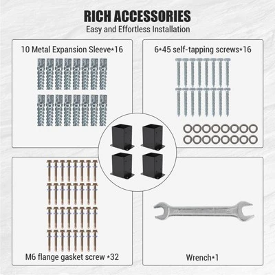 - Pre-Drilled Holes & Full Hardware Kit:Pre-drilled holes simplify alignment. Includes bolts, anchors, and screws for wood/concrete surfaces—no extra purchases needed.