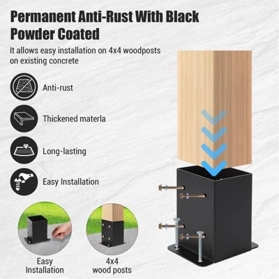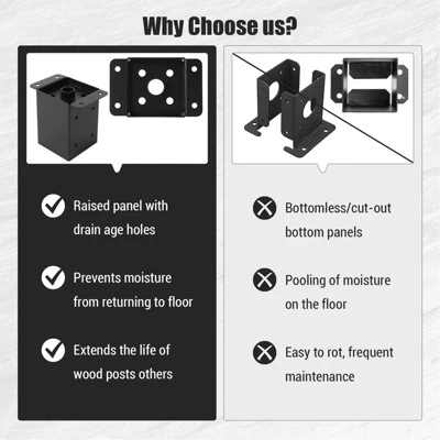 1.Multi-Use Support for All Outdoor Projects These heavy-duty post bases are designed to secure a wide range of outdoor structures: deck footings, gazebos, porch railings, mailbox stands, and even furniture legs. The 4-pack is perfect for small upgrades or quick fixes, while larger packs (8-pack/10-pack) cater to extensive projects like full deck builds or large pergolas. Whether you¡¯re repairing a fence or constructing a new pavilion, these brackets provide reliable foundational support. 2.Elevated Design to Protect Wood & Extend Lifespan Featuring an elevated interior base, the brackets lift wood posts 0.3″ above the ground¡ªpreventing direct contact with moisture to avoid rot and decay. Built-in drainage holes allow trapped water to escape, doubling the lifespan of your structure. Engineered to withstand rain, snow, and harsh outdoor conditions, they keep posts stable and durable year-round. 3.Perfect Fit for 4×4 Lumber with Flexible Pack Options Designed for true 4×4 lumber (3.5″¡Á3.5″), these brackets come in versatile pack sizes to match your project scale: 2-packs for quick fence repairs, 4-packs for standard deck footings, and 8-packs for large pergolas or gazebos. The precise fit ensures secure attachment, eliminating wobble and enhancing structural integrity. 4.Compatible with 6×6 Lumber for Larger Structures For bigger projects, select 4-pack or 8-pack options sized to fit standard 6×6 lumber (5.75″¡Á5.75″). These flanged-end bases are ideal for heavy-duty applications like large decks, tall fences, or robust pergolas¡ªsupporting everything from minor repairs to full rebuilds with equal reliability. 5.Durable Construction & Hassle-Free Installation Crafted from heavy-duty steel with a powder-coated finish, the brackets resist rust and corrosion for long-lasting performance. Each kit includes all necessary screws and anchors, compatible with both wood and concrete surfaces. Pre-drilled, aligned holes ensure quick, wobble-free attachment¡ªinstall in minutes on concrete slabs or wooden frames, with no guesswork required.
