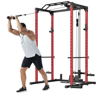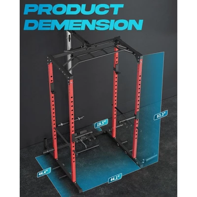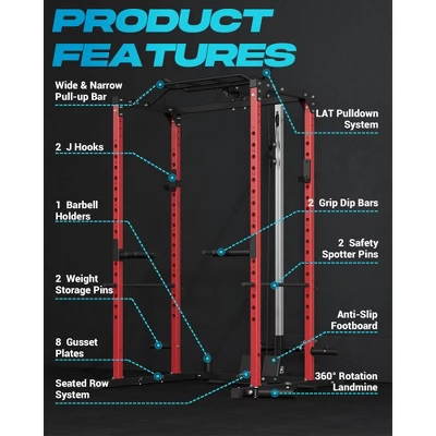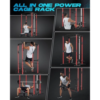 - 【All in One Home Gym Power Rack】Upgrade your home gym equipment with this multifunctional power cage squat rack. Perform squats, bench press, pull-ups, dips, lat pulldowns, seated rows, landmine rotations, and more—your complete at home gym in one machine.