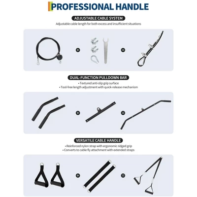 - Multi-Functional Training System: Engineered with four interchangeable attachments—lat pulldown bar, triceps rope, and dual fly handles—this pulley system enables complete workouts including biceps curls, triceps pushdowns, lat pulldowns, rows, and flys. Maximizes muscle engagement while improving strength, coordination, and endurance through full-range movements.