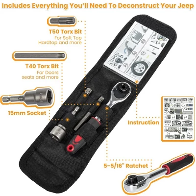 1.Perfect Fit for Wrangler Models: Elevate Your Off-Road Adventures Designed to seamlessly work with Wrangler JL, JK, JKU, and JL JLU Sports models, this quick release tool set unlocks your vehicle¡¯s versatility. Whether you¡¯re prepping for a weekend camping trip, hitting the trails, or simply craving an open-air drive, it makes removing hard tops and doors a breeze. Compatible with all key Wrangler variants, it ensures a snug, secure fit¡ªno fumbling with ill-fitting tools¡ªso you can transition from enclosed to open-air in minutes, maximizing your adventure potential. 2.Chrome Vanadium Steel: Unbeatable Durability & Corrosion Resistance Crafted from premium chrome vanadium steel, this tool set delivers exceptional strength and high torque performance, tackling even the tightest bolts with ease. The steel¡¯s inherent toughness resists bending or warping under pressure, while a corrosion-resistant finish protects against rust, rain, and mud¡ªcritical for off-road environments. Unlike flimsy alternatives, it¡¯s built to withstand frequent use, ensuring reliable performance trip after trip, year after year. 3.Effortless Operation: Simplify Hard Top & Door Removal Engineered for user-friendliness, this tool set eliminates the hassle of DIY vehicle maintenance. Its ergonomic design fits comfortably in hand, reducing strain while providing optimal leverage to loosen stubborn fasteners. Whether you¡¯re removing a heavy hard top or detaching doors for a clearer view, the tools work smoothly to streamline the process¡ªno professional experience required. Perfect for both seasoned off-roaders and casual drivers, it turns a tedious task into a quick, frustration-free step. 4.Compact & Portable: Ready for Any Adventure Small in size but big on utility, this tool set is designed for on-the-go convenience. Its compact profile fits easily into your Wrangler¡¯s glove box, center console, or gear bag, taking up minimal space so you can keep it handy wherever you roam. Whether you¡¯re stopping at a trailhead to remove doors or camping and needing to stow the hard top, the portability ensures you¡¯re never caught without the right tool¡ªmaking impromptu adventures that much easier. 5.Complete Kit: All Tools You Need in One Package This all-in-one set includes everything required for hard top and door removal: high-torque wrenches, ratchets, and Torx drills, each tailored to Wrangler-specific fasteners. No more hunting for mismatched tools or making multiple trips to the hardware store¡ªthis kit has you covered. From loosening hinge bolts to detaching roof clamps, every component works in harmony to ensure a seamless, efficient process, making it an essential addition to any Wrangler owner¡¯s gear.