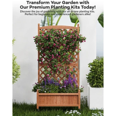 Raised Garden Bed with Trellis Wooden Planter Box with Wheels for Vegetables Flowers & HerbsProduct DescriptionGrow vertically, move freely, and garden comfortably with this raised garden bed—featuring a built-in trellis for climbing plants and locking wheels for easy mobility. Crafted from sturdy natural fir wood with reinforced boards, it’s durable enough for year-round outdoor use, while the elevated design reduces back strain. The 61.5″ tall trellis supports vining veggies (tomatoes, cucumbers) or flowering vines (clematis, roses), and the smooth-rolling casters let you chase sunlight or shelter plants from storms. Whether you’re an urban gardener with a small balcony or a backyard enthusiast, this bed blends functionality, style, and convenience for thriving plants.Key Features1. Premium Fir Wood Construction for Year-Round DurabilityThis garden bed is built to last with natural fir wood—chosen for its strength, resistance to warping, and ability to withstand outdoor elements. The boards are thickened (thicker than standard wooden planters) to hold large volumes of soil and the weight of mature plants without bending, while metal brackets reinforce the trellis, ensuring it can support up to 55 lbs (25 kg) of climbing vines. Unlike flimsy plastic planters that crack in heat or fade in sun, the fir wood (treated with a weather-resistant finish) resists rotting, mildew, and insect damage—making it suitable for year-round use, from rainy springs to snowy winters. It’s a long-term investment that stays sturdy and attractive, even with regular exposure to the elements.2. Spacious Planting Area + Climbing Trellis for Vertical GrowthThis bed maximizes growing space with two key components:• Generous Planter Box: The deep, wide base provides ample room for root growth—perfect for vegetables (tomatoes, peppers), herbs (basil, mint), or flowers (marigolds, petunias). You can grow a mixed garden (e.g., tomatoes in the bed + basil around the edges) without overcrowding.• 61.5″ Tall Diamond Lattice Trellis: The built-in trellis gives climbing plants a structure to grow upward, saving ground space (ideal for small balconies or patios). It supports heavy vines like cucumber or grape, and even flowering climbers like roses or clematis, adding vertical interest to your garden. The rich brown finish of the wood complements green foliage and colorful blooms, blending seamlessly with any outdoor decor.3. Smart Drainage & Elevated Design for Plant Health & ComfortTwo thoughtful design elements make this bed both plant-friendly and gardener-friendly:• Dual Drainage Holes: Located at the base of the planter box, these holes prevent waterlogging by letting excess water escape—critical for avoiding root rot in overwatered plants. They also promote airflow in the soil, keeping it loose and fertile for healthier root development.• Elevated Structure: The bed is raised off the ground (height not specified, but designed to reduce bending), so you can tend to plants while standing or leaning slightly—no more kneeling on hard ground or straining your back. This is especially helpful for seniors, gardeners with mobility issues, or anyone who wants to avoid post-gardening soreness.4. Easy Mobility with Lockable WheelsThe four smooth-rolling casters (two with locking brakes) turn this stationary planter into a flexible gardening tool:• Chase Sunlight: Move the bed to sunnier spots as seasons change (e.g., from a shaded patio in summer to a sunnier backyard in fall) to keep light-loving plants happy.• Shelter from Storms: Roll it indoors (to a sunroom or garage) or under a covered porch during heavy rain, strong winds, or frost—protecting delicate plants without lifting or disassembling the bed.• Smooth Gliding: The wheels work on multiple surfaces, including grass, concrete, and decking, so you can reposition the bed anywhere in your outdoor space with minimal effort. When you find the perfect spot, lock the two brakes to keep the bed securely in place.5. Versatile for Any Indoor/Outdoor SpaceThis bed adapts to different gardening needs and spaces:• Urban Balconies: The vertical trellis and compact footprint (ideal for small spaces) let you grow veggies or flowers without taking over your balcony.• Backyard Gardens: Use it as a focal point, pairing climbing tomatoes with herbs in the bed for a functional, attractive display.• Patios: Add rustic charm to your patio with flowering vines on the trellis, turning the bed into a decorative accent.• Indoor Sunrooms: Bring it inside during winter to grow herbs or small flowers in a sunny spot—no need to sacrifice gardening during cold months.It’s perfect for beginners (low-maintenance, easy to use) and expert gardeners (versatile, durable) alike.