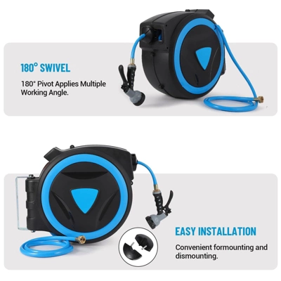 Retractable Garden Hose Reel 90ft – Automatic Rewind Hose Reel with 9-Function NozzleProduct Details:1. Effortless Automatic Rewind SystemExperience the ultimate in garden convenience with a self-retracting hose reel that stores your hose perfectly with a simple, gentle tug. The innovative slow-return mechanism ensures smooth, controlled retraction every time, eliminating the frustration of manual winding and keeping your outdoor space tidy and trip-free.2. Advanced Kink-Resistant TechnologyEngineered for frustration-free watering, the high-quality 5/8-inch hose is reinforced to resist kinking and tangling under pressure. The automatic locking mechanism secures the hose at any desired length, providing uninterrupted water flow for efficient gardening, cleaning, and lawn care without constant stops to straighten the hose.3. Professional-Grade Spray ControlMaster every watering task with the versatile 9-pattern spray nozzle. Select from precision options including jet, shower, mist, soaker, flat, center, cone, triangle, and rinse settings to gently water delicate seedlings, powerfully clean patios, or efficiently soak garden beds with professional results.4. Full-Rotation Swivel Mounting BracketAchieve complete watering coverage with a 180-degree swivel bracket that rotates freely to guide the hose around obstacles and into tight spaces. The wall-mounted bracket provides stable, multi-directional access to every corner of your yard, garden, or driveway without dragging or straining the hose.5. Complete Ready-to-Install KitGet started immediately with a comprehensive package including the 90-foot retractable hose reel, 9-function spray nozzle, heavy-duty wall mount, installation hardware, and clear user manual. The robust all-in-one system delivers exceptional performance and durability for residential and professional gardening needs.Specifications:Hose Length: 90 FeetHose Diameter: 5/8 InchRetraction System: Automatic Slow-ReturnNozzle: 9-Function Spray PatternsMounting: 180¡ã Swivel BracketIncluded Components: Wall Mount, Nozzle, Hardware, ManualMaterial: Premium kink-resistant hoseOperation: Automatic locking and retractionWeight: 27.94 PoundsBest For: Gardens, Lawns, Patios, Vehicle Cleaning
