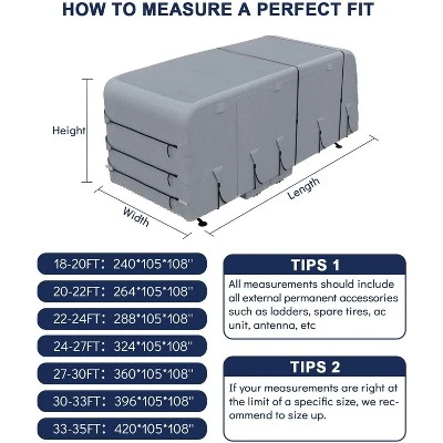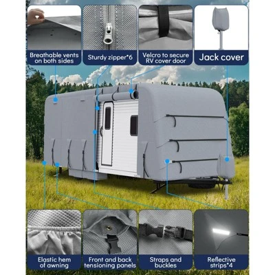 Universal Fit RV Cover ¨C All-Weather Waterproof Protection with Enhanced VentilationEngineered for superior outdoor protection, this heavy-duty RV cover delivers complete defense against rain, wind, UV damage, and snow while preventing moisture buildup. Designed to fit trailers from 18 to 35 feet, it features reinforced construction, intelligent ventilation, and convenient access points. The complete accessory kit ensures secure fastening and easy maintenance for recreational vehicles and toy haulers.Key Features:Ultra-Durable Waterproof & Tear-Resistant BuildConstructed with 4-ply non-woven fabric and double-stitched seams, providing exceptional tear resistance (up to 400 lbs) and complete waterproof protection against heavy rain and moisture.Windproof Design with Secure Fastening SystemEquipped with two heavy-duty straps, elastic hem corners, and adjustable tension panels for a snug, secure fit that prevents lifting and flapping in strong winds and stormy conditions.UV Protection & All-Weather ResistanceTreated with anti-UV composites to shield against sun damage, fading, and premature aging. Resists snow accumulation, scratches, and harsh environmental elements.Optimized Ventilation & Quick AccessSix integrated air vents reduce condensation and promote airflow, while six zippered access panels allow convenient entry without removing the entire cover. Compatible with toy haulers.Complete Protection PackageIncludes: 1 RV cover, 4 tire covers, 2 reinforced straps, 6 gutter spout covers, 4 bottom straps, 3 front/rear straps, 1 repair patch, and a storage bag.Specifications:Material: 4-Ply Non-Woven Fabric with UV CoatingAvailable Sizes: 18-20FT, 20-22FT, 22-24FT, 24-27FT, 27-30FT, 30-33FT, 33-35FTProtection: Waterproof, UV-Resistant, Windproof, SnowproofVentilation: 6 Air VentsAccess: 6 Zippered PanelsIncluded Components: Cover, Tire Covers, Straps, Gutter Covers, Repair Patch, Storage BagIdeal For:Seasonal storage of RVs and trailersOutdoor protection against sun, rain, snow, and debrisToy haulers and campers with rear access doorsPreventing moisture buildup and UV damageLong-term vehicle preservation