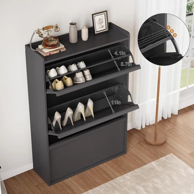 1.Space-Saving Design for Compact Areas With a slim, modern profile, this narrow shoe cabinet is tailor-made for small spaces¡ªperfect for entryways, hallways, closets, or apartments where floor space is limited. Its three flip drawers maximize vertical storage, efficiently organizing up to 24 pairs of shoes (from sneakers to sandals) without cluttering your front door or mudroom. By tucking away footwear in a streamlined unit, it keeps your entryway tidy and welcoming, even in cozy living spaces. 2.Adjustable Shelves for Versatile StorageThe cabinet¡¯s customizable shelves adapt to all types of footwear, ensuring a perfect fit for every pair. Whether you need to store bulky boots, delicate high heels, flat shoes, or even men¡¯s size 12 sneakers, the adjustable design lets you modify shelf heights to accommodate them all. Beyond shoes, the spacious top surface doubles as a handy spot for daily essentials: drop your keys, wallets, or small bags, or display decor like potted plants or baskets¡ªadding functionality without sacrificing style. 3.Sturdy, Safe Construction Built to LastCrafted from high-quality engineered wood, this freestanding shoe rack boasts a scratch-resistant and water-resistant finish, standing up to daily use, scuffs, and accidental spills. Its robust frame ensures stability, while included anti-tip hardware adds an extra layer of safety¡ªcritical for homes with children or pets, preventing tipping even when drawers are fully extended. Designed for longevity, it remains a reliable storage solution for years to come. 4.Hidden Flip Drawers: Tidy & StylishThe tilt-out flip drawers keep shoes concealed and dust-free, maintaining a clean, uncluttered look in your entryway. Smooth, easy-to-grip handles allow quick access to your footwear, while the minimalist black finish and sleek lines blend seamlessly with diverse decor styles¡ªfrom farmhouse and modern to traditional. Whether placed in a foyer or closet, it elevates the space with understated elegance while hiding the mess. 5.Easy Assembly & Reliable SupportSetting up this shoe cabinet is hassle-free, thanks to clearly labeled parts and step-by-step instructions¡ªno advanced DIY skills needed. The unit arrives in secure packaging to prevent damage during shipping, ensuring it reaches you in perfect condition. If you have questions or need replacements, our responsive U.S.-based customer service team is ready to assist, ensuring your satisfaction with every purchase.