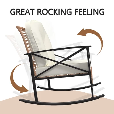 - 【Outdoor Rattan Design】The beautiful rattan design of this 3 pieces outdoor patio furniture set adds a modern touch to any space, these rocking chairs complement various outdoor settings. The modern 3 piece wicker outdoor furniture set is an excellent add to a front or back porch, and there’s a beautiful contrast in textures between the rattan seat and the metal legs. Outdoor patio set is a great addition to yard, sunroom, by the pool, or in your backyard.