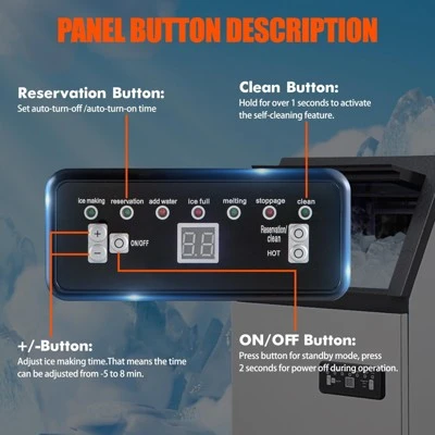 - Multi-Function Control Panel: This commercial ice maker machine features a smart LCD panel for seamless operation and control. Equipped with a reservation button for auto turn-off and on settings, you can easily adjust cube sizes using the +/- buttons to modify ice-making time, and enjoy the convenience of one-touch automated cleaning for effortless maintenance