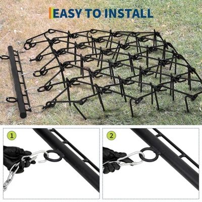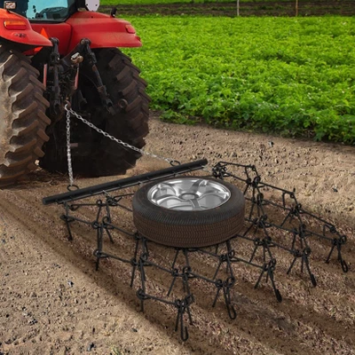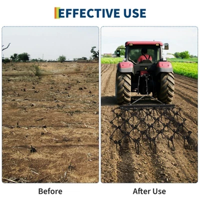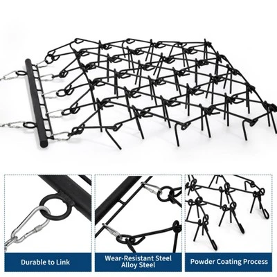 - Heavy-Duty Durability: The heavy-duty steel construction and powder coating finish make our chain drag harrow durable, resistant to deformation and able to adapt to various rugged terrains. With 3/8″ Thick, 4-3/4in (120mm) long tines, our chain drag harrow can deeply break apart soil clumps, harrow through tough ground, and make the entire soil surface smooth