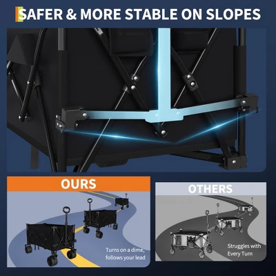 Heavy Duty Beach Wagon Cart – All-Terrain Collapsible Utility Wagon with 350lb Capacity & Cup Holders (Blue, Medium)1?? Professional Mobility System? 4 oversized 7″ x 4″ all-terrain wheels (2 locking front + 2 fixed rear)? 360¡ã swivel steering with sealed ball bearings? Sand-tread TPU tires for beach/grass/rocky terrain2?? Commercial-Grade Construction? 1.2″ reinforced steel frame with anti-corrosion coating? Double-stitched 600D Oxford fabric with ripstop lining? 350lb dynamic / 500lb static capacity3?? Smart Storage Solutions? 38.5″L x 22.8″W x 35″H cargo space (5.8 cu.ft capacity)? Integrated convenience features:¡ú 2 insulated cup holders (fits 32oz bottles)¡ú Side organizer pocket (9″ x 5″)¡ú Removable waterproof cover4?? Instant One-Second Folding? Patented quick-release mechanism? Ultra-compact storage: 8.6″ x 10.2″ x 26.8″? Adjustable telescoping handle (34″-43.3″ height)5?? Multi-Purpose Performance? Perfect for:¡ú Beach outings (holds 4 chairs + cooler)¡ú Camping trips (fits 2 sleeping bags + gear)¡ú Garden/retail use?? Technical Specifications? Unfolded: 38.5″L x 22.8″W x 35″H? Wheelbase: 32″? Ground Clearance: 2.5″?? Performance Features¡ú 200¡ã wheel rotation¡ú 4:1 steering ratio¡ú IP54 water resistance?? Premium Applications? Family beach days ? Sports events? Farmers markets ? Warehouse logistics?? Package Includes?? Folded wagon assembly?? Storage cover & strap?? Quick-start guideThe professional-grade folding wagon – making heavy hauling effortless anywhere.